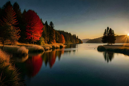 Stunning sunset over a calm lake, with vibrant autumn foliage reflected in the still water. Peaceful and serene atmosphere.