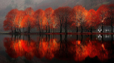 Stunning autumn scene featuring bright red trees reflected in a calm lake, creating a serene landscape with a quaint house, mist, and tranquil beauty.