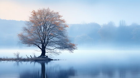 A tranquil scene featuring a solitary tree and a bench by a calm lake, enveloped in thick fog. The reflection in the water enhances the serene atmosphere.