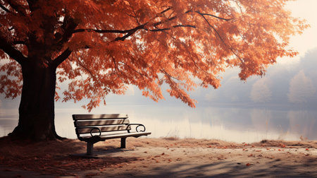 Beautiful autumn landscape with a lonely bench on the shore of the lake