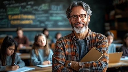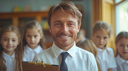 Portrait of a confident male teacher standing in a classroom with students. He is smiling and holding a tablet, showcasing a positive and professional image.