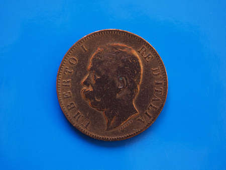 10 cents coin money (ITL), currency of Kingdom of Italy over blue background
