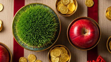 Meticulously arranged overhead flat lay of a vibrant, golden Haft-Seen table for Nowruz. Emphasizes highly reflective apples and lush Sabzeh.
