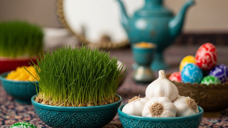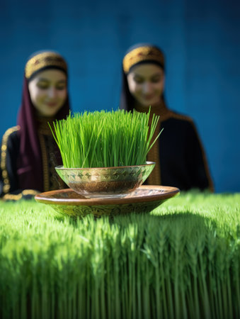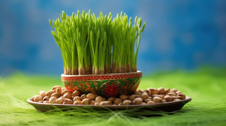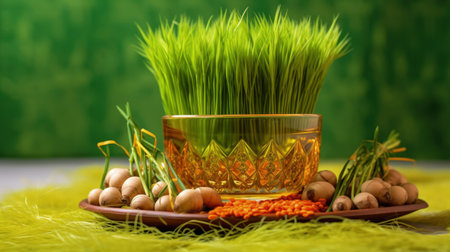 Celebrating renewal with sprouted wheat grass: happy nowruz, a festive homage to nature's rebirth, cultural traditions, and the joyous spirit of Persian new year, embracing health and vitality