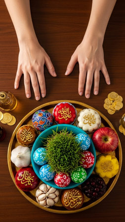 Detailed 9:16 flat lay of a Haft Seen table. Focus on Sabzeh and painted eggs symbolizing Nowruz (Persian New Year) renewal and spring. Elegant cultural display.