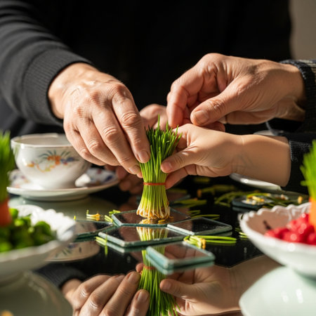 Close-up of elderly hand guiding child's hand placing Sabzeh (sprout) on the Haft-Seen table for Nowruz. Intimate detail, sunlit 1:1.