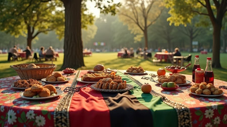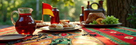 Colorful outdoor picnic table with traditional food and drinks in sunlit park setting. That the image is generated using AI.