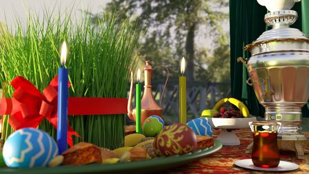 Novruz concept - interior of Novruz dining table, wheatgrass