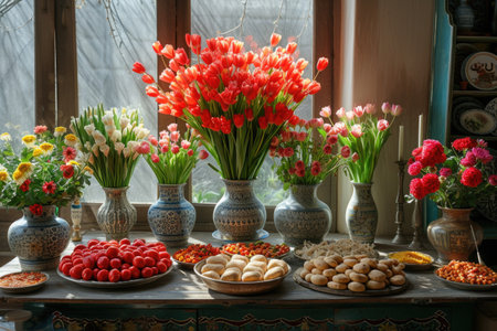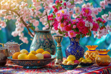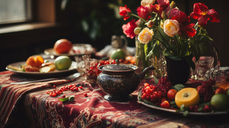 Spring Equinox celebration showcases a traditional Nowruz table with haft-sin items like apples and flowers arranged for cultural festivities.