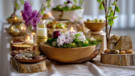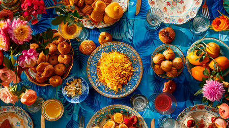 Decorative bowls display fruits, sweets, and dishes arranged for a joyful gathering. Candles and greenery enhance the festive feel.