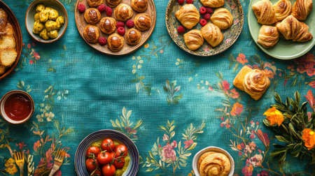 Top view of table with baklava, buns, fruits, and dried fruits. Perfect for celebration, hospitality, and Middle Eastern cuisine themes.