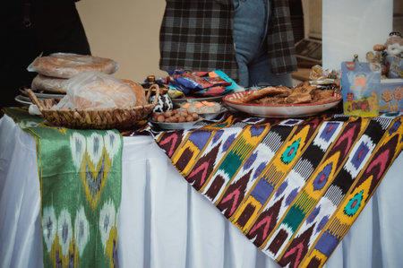 Traditional Uzbek Khan-atlas fabric and a national food in a street cafe