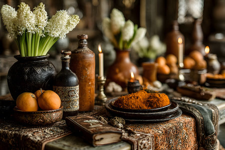 A vintage-style dining table is adorned with white flowers, candles, and an assortment of metal and ceramic containers. oranges and a dish of spices add vibrant color, setting a warm and rustic ambiance. Generative AI
