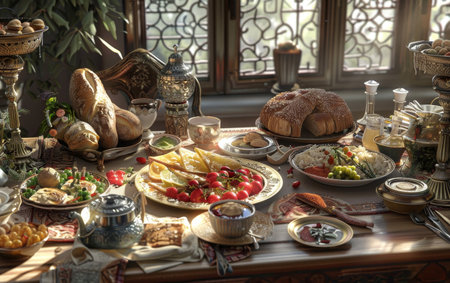 An AI-generated illustration of a traditional Ramadan dinner table with an abundance of dishes.