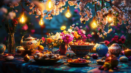 A vibrant Nowruz celebration showcases a table filled with traditional dishes and floral arrangements. Soft lights hang above as guests gather to enjoy the festive atmosphere.