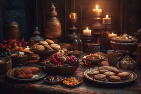 An AI-generated illustration of a traditional Ramadan dinner table illuminated by candlelight.