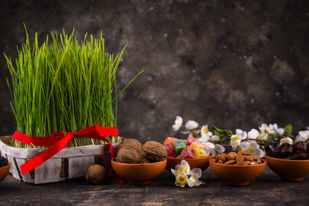 Novruz national Azerbaijan holiday spring new year celebration concept, wheat grass semeni .