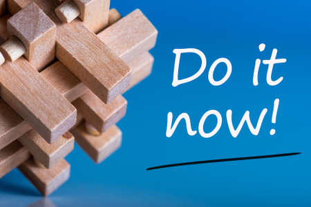 Do it now concept for self belief, positive attitude and motivation. Brainteaser close up at blue background