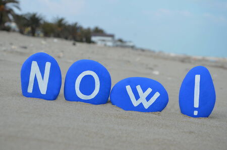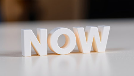 NOW word in white plastic letters on smooth surface with soft background light creating calm mood