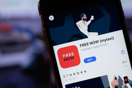 New York, USA - 15 May 2020: mytaxi FREE NOW mobile app logo on phone screen, close-up icon, Illustrative Editorial.