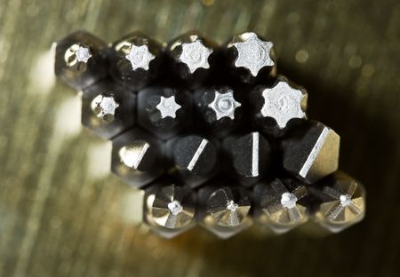 Set of screwdriver heads (bits) Tools collection, close-up, selective focus. blurred dark background.