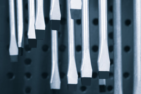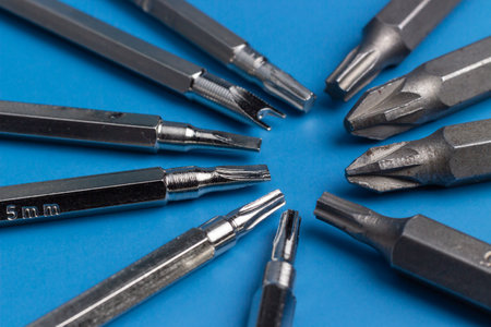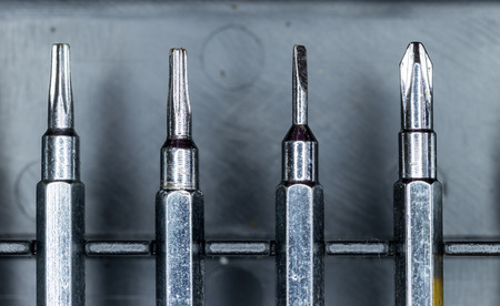 Various screwdriver heads, abstract composition with accent to differences and metal material, blue illumination.