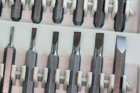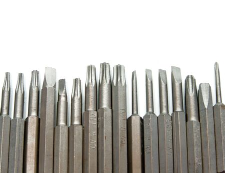 Interchangeable screwdriver bit set, isolated on white, selective focus, dof, close-up