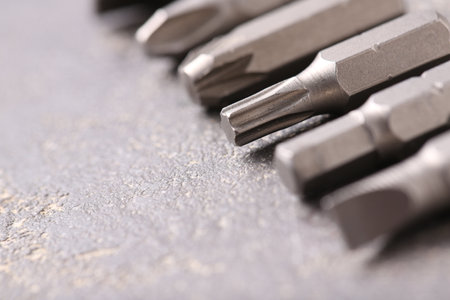 Screwdriver bits, different designs on grey background. Copy space. Close up