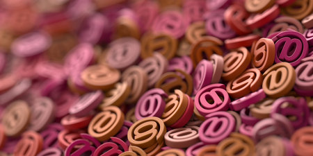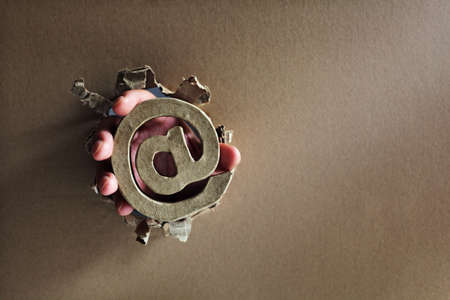 The glass symbol @ is under a beam of light, located on a golden background. 3D image of the symbol At. 3D rendering.