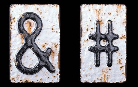 3D render set of symbols ampersand and hash made of forged metal on the background fragment of a metal surface with cracked rust. 3d rendering