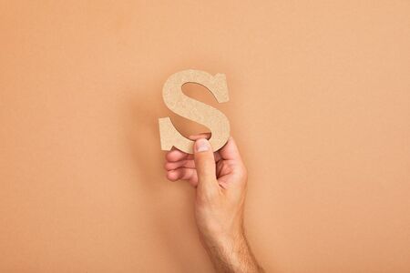 A vintage letterpress dollar sign symbol on a white washed wooden board.