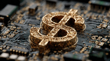 This close-up image features a gold dollar sign resting on a circuit board, symbolizing the intersection of finance and technology in the modern economy.