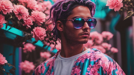 A man stands against a backdrop of radiant graffiti, his silhouette highlighted with bold neon colors. The urban art creates a lively atmosphere rich in creativity and expression.
