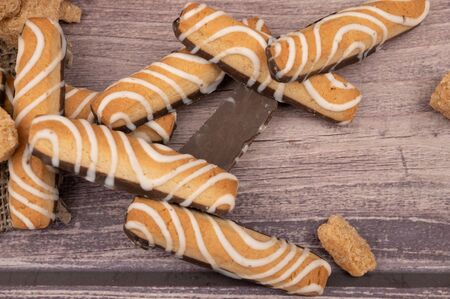 Cookie sticks with chocolate and white icing on the background of textured fabric. Close up