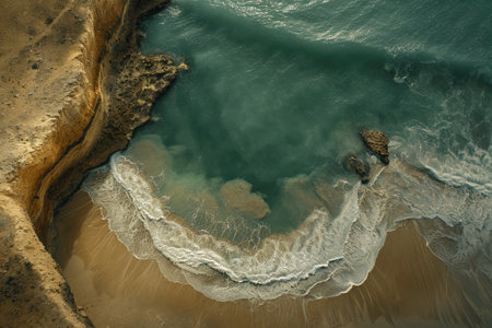 Aerial view of ocean waves crashing against rugged rocks along the coastline, showcasing the beauty and power of nature in a serene environment.