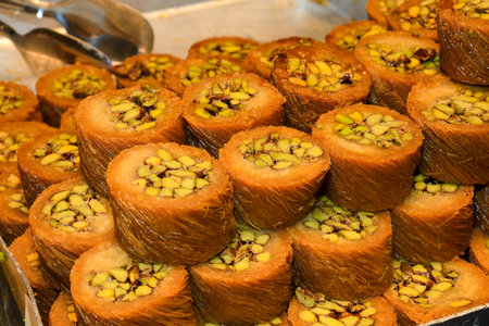 Delicious pistachio baklava displayed at a market