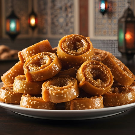 Close up Chebakia placed on a clean white plate creating warm Middle Eastern dessert atmosphere