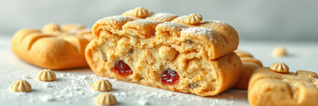 Delicious golden pastries with powdered sugar arranged neatly on a white surface in a cozy kitchen setting