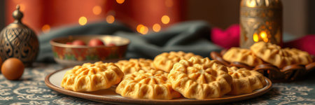 A beautiful arrangement of traditional pastries resting on intricate patterned fabric, capturing the essence of cultural cuisine and festive gatherings.