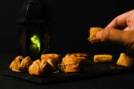 A low key and selective focus picture of Arabic baklava on slate plate with lantern insight.