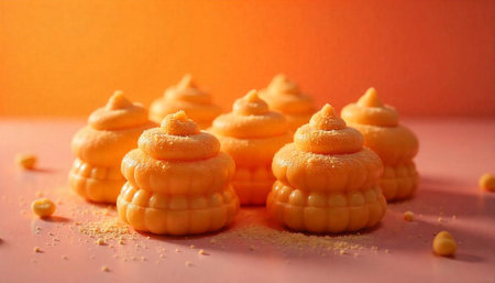 Orange candy dessert with frosting arranged on pink surface