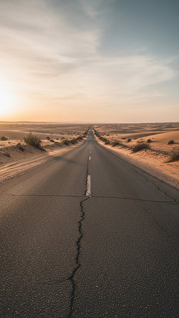Hazy showing an asphalt road with a cracked surface extends straight into the horizon through a vast desert landscape of sand dunes and sparse vegetation under a...