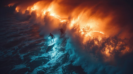 a couple of people riding surfboards on top of a wave in the middle of a body of water with orange and blue clouds in the background and a man standing on a surfboard. .