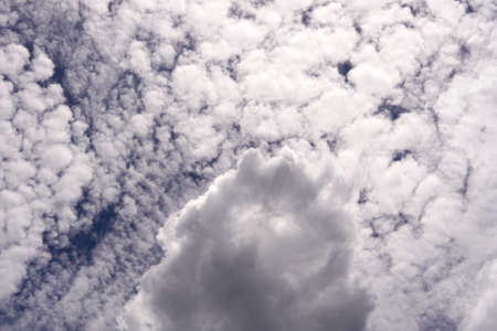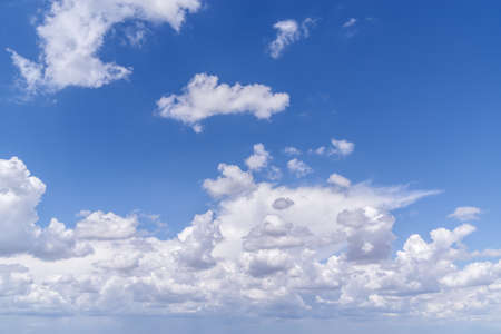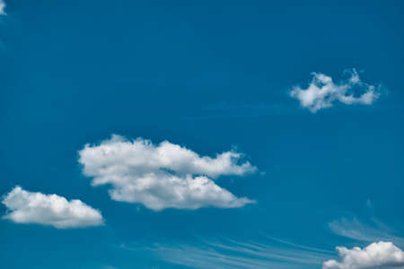 White cumulus clouds in a blue sky. Backgrounds with a pattern of high-beam clouds. Weather, seasonality, ecology, clear sky. Peace