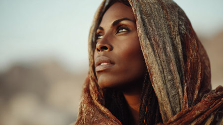 A woman stands confidently wearing a shawl that flows elegantly while looking thoughtfully at the horizon.