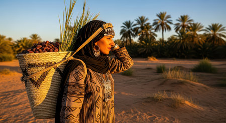 Female in traditional dress carrying basket in desert oasis