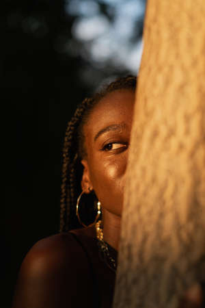 Close-up portrait of a young black woman hiding half of her face behind a tree in the park