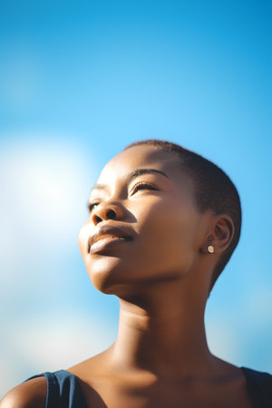 Closeup portrait of a beautiful african american woman on blue sky background