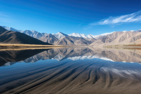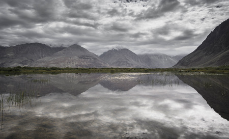 Beautiful view of lake and blue sky reflected in Nubra Valley in summer