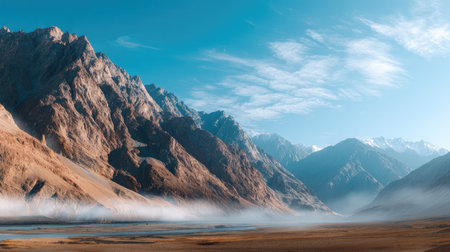 A stunning mountain landscape featuring towering peaks under a clear blue sky. Gentle mist hovers over the valley, creating a serene and peaceful atmosphere, perfect for nature enthusiasts and travelers.